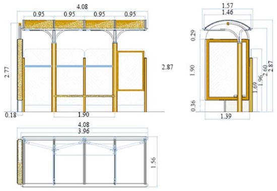 Based on all the above, the use of these structures for solar exploitation in an integrated way with the architecture involves the installation of flexible solar panels on the rooftop of the existing bus shelters. According to their geometry, it is possible to install 4 SunPower flexible panels with a maximum power of 170 W and 1153 × 810 × 20 mm [38] where the average slope is 25 degrees (Figure 5 and Figure 6). The use of two maximum power point trackers (mppt) allows to achieve better efficiency of the installation in the presence of shadows.