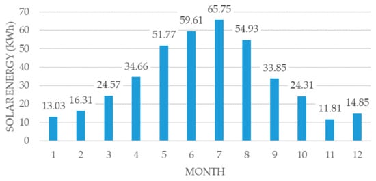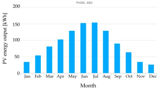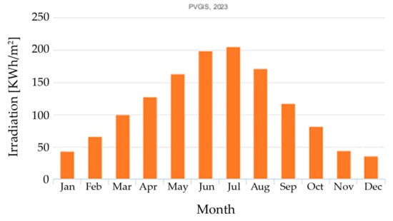 Based on the indicated parameters, the PVGIS tool provides all input and output data (irradiation and energy production) in different ways: (i) csv format; (ii) json format (iii); web format. This last option allows the direct visualization through dynamic graphs and tables that show the estimated average amount of irradiation (Figure 7) and the average amount of production (Figure 8) expected for each month based on the input data.