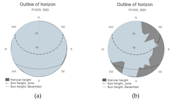 Outline of horizon for the same position through: (a) horizon calculated by PVGIS; (b) horizon file uploaded by the user.