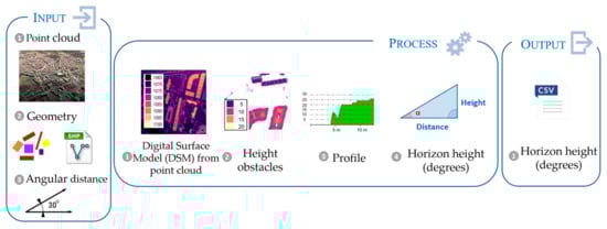 With the aim of obtaining a precise estimation of the shadows on bus shelters, including the real obstacles within a city such as buildings and other types of constructions, or trees, a methodology has been developed to automatically obtain the horizon height at a given point. The output of the methodology developed is a file with the horizon height in csv format (Figure 10).