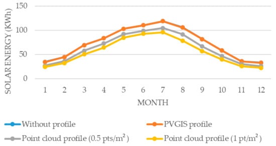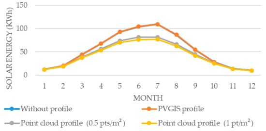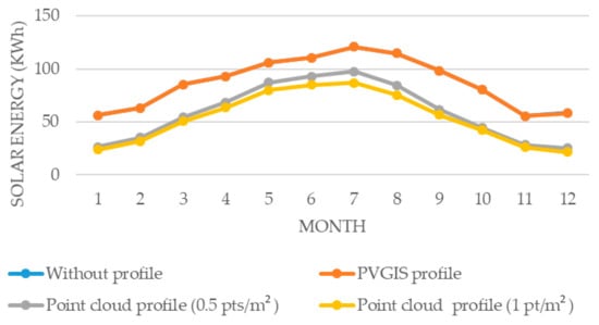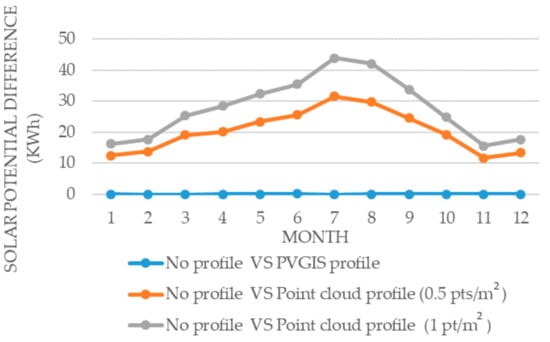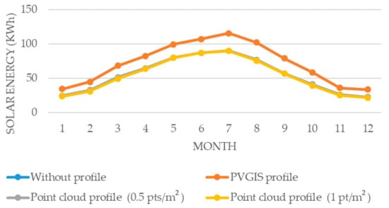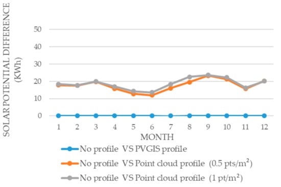 As can be seen, the main difference in the estimation of solar energy is produced by using the profile obtained from the point cloud versus not using any horizon profile. The following graph (Figure 17) shows in more detail the difference between both products on a monthly basis in the presence of trees and buildings.