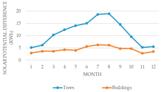 Regarding solar electricity, the following images (Figure 15 and Figure 16) show graphically the effect of the difference in the use of the horizon profiles when shadows are produced by trees and by buildings. The results corroborate that the difference is more accentuated in the case of trees, reaching a maximum in July (44 kWh). In the case of buildings, the difference is more constant throughout the year, with the differences between the use of LiDAR point cloud derived profiles being considerably reduced.