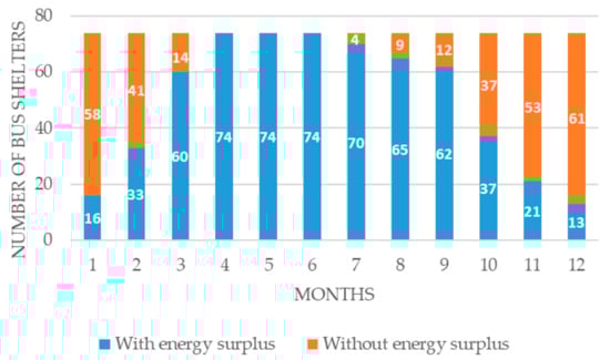 Taking these previous consumption values as a starting point and basing on the knowledge previously obtained, the solar potential of these structures in the city of Avila is estimated using the PVGIS tool in combination with the highest resolution horizon profile. Based on an overall balance between the total energy consumed and the total energy generated throughout the day, the results of this analysis indicate that the integration of flexible solar panels in the current model of bus shelters allows enough energy to be generated in some months to cover the energy consumed. Figure 18 shows the number of bus shelters with and without energy surplus throughout the year. There is no case where the required energy demand is the same as the solar energy production. Figure 19 shows the geographical distribution of bus shelters with and without energy in December.
