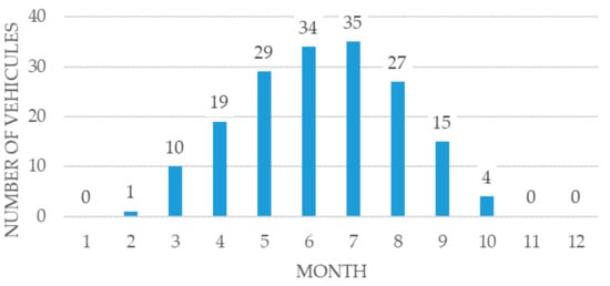 Electric scooters and electric bicycles require on average 0.350 kWh and need 5 h on average to fully charge [40]. Based on the results of the average energy surpluses and consumption of light vehicles, it is estimated that these structures can be converted into charging points without additional energy costs. In January, November and December, the energy generated is insufficient to cover the energy consumption of a bus shelter. The results show that the maximum average number of vehicles charged per bus shelter with an energy surplus was 35 vehicles in July (Figure 21).