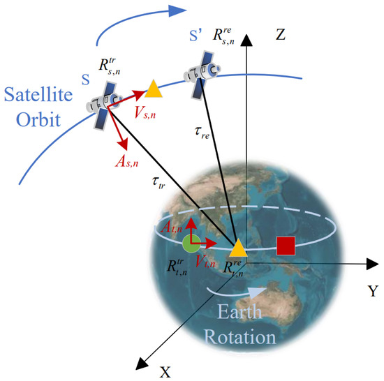 Firstly, using the Lagrange interpolation method based on the measured sequence of the satellite’s position and velocity in the WGS84 coordinate system, the position and velocity of the radar at each pulse signal transmission time can be obtained, and the acceleration of the satellite is obtained by the difference in the satellite velocity. Using measurements of satellite position and velocity, satellite attitude, and antenna pointing, the target position can be calculated. Taking into account the Earth’s rotation, the target velocity and acceleration can be further calculated.