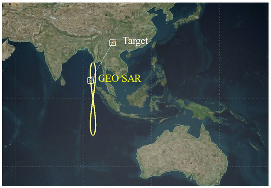The simulation verification was conducted using the parameters of the GEO SAR satellite [27,28,29,30]. Operating in an inclined geosynchronous orbit (IGSO), this advanced satellite offers SAR observation capabilities with hourly coverage, a wide swath (500–3000 km), a moderate resolution (20–50 m), all-weather capabilities, and continuous monitoring throughout the day. The obtained SAR images in the L-band can be applied to industries including disaster reduction, land management, seismic activities, water resources, meteorology, oceanography, agriculture, environmental protection, and forestry. The orbital elements and radar parameters of the GEO SAR satellite are provided in Table 2.