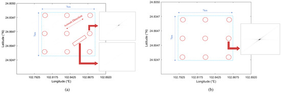 The satellite operates in a geosynchronous orbit with a revisit cycle of 1 day. Figure 6 illustrates the orbital path of the satellite based on the orbital elements provided in Table 2. The target in Figure 6 is the central point of the observed target array set by the simulation, located at 102.83 degrees east longitude and 24.88 degrees north latitude. The target array consists of nine point targets with an array size of km.