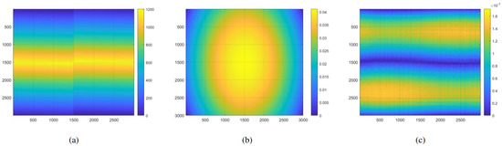 To determine the optimal interpolation method, an experiment was conducted using a grid of size 3000 × 3000 with 1 m grid spacing. The target point was positioned at the grid’s center. The slant range between the satellite and each grid point was calculated using the three aforementioned interpolation methods, as well as the direct slant range calculation method. The errors in the slant range between the three interpolation methods and the directly calculated range were measured and are illustrated in Figure 10. The computation time and maximum slant range error are presented in Table 4.