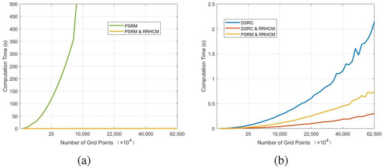 Comparison charts of computation time based on PSRM, DSRC, and RRHCM: (a) comparison of PSRM and PSRM&RRHCM, (b) comparison of DSRC, DSRC&RRHCM and PSRM&RRHCM.