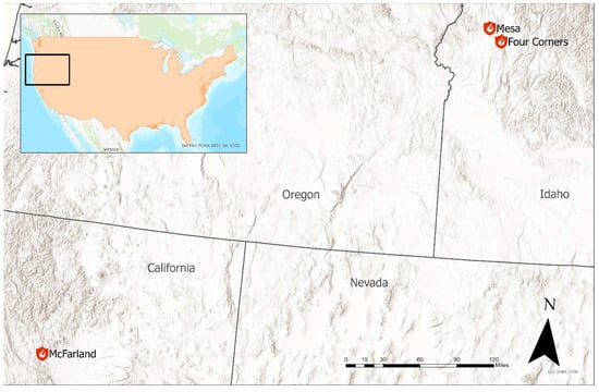 This experiment focused on three study areas, each targeted spatially and temporally on a wildland fire. The first was the Four Corners fire near Cascade, Idaho (at 44.537, −116.169) which started on 13 August 2022, was contained on 24 September 2022, and burned 5556 hectares [35]. The second was the McFarland Fire near Platina, California (at 40.350, −123.034) which started on 30 July 2021, was contained on 16 September 2021, and burned 49,636 hectares [36]. The last was the Mesa Fire near Council, Idaho (at 44.709, −116.348) which started on 26 July 2018, was contained on 25 August 2018, and burned 14,051 hectares [37]. Figure 1 shows the locations of the three study areas relative to each other.