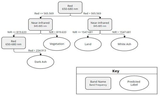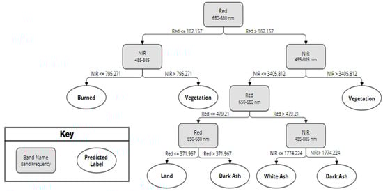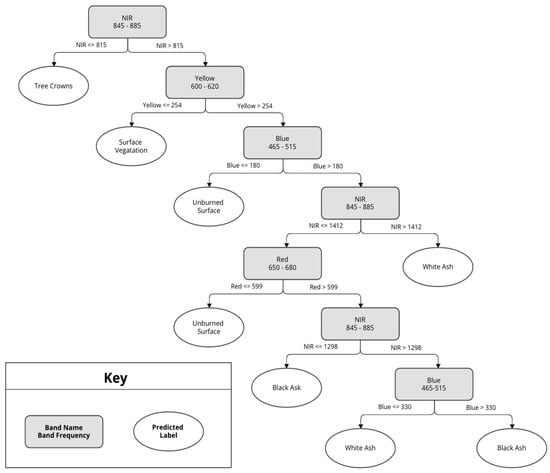 Hamilton [33] utilized an Iterative Dichotomiser 3 (ID3) [34] to build a decision tree and report the information gain of each attribute from the red, green, and blue bands in the color image as well as texture, which is a measure of spatial context. Information gain facilitated the identification of the most effective texture metric for machine learning-based mapping of the burn extent and severity, where severity was evidenced by the existence of white versus black ash. By reporting on information gain, it was possible to observe the strength of an attribute’s ability to accurately split the training data. Information gain was calculated based on user-designated labels based on the information content of the training data in relation to a given attribute [26]. In order to train the ID3, training regions were designated for black ash, white ash, and unburned vegetation in imagery from multiple wildland fires. Once the decision tree was constructed, the attributes with the most information gain were represented in nodes closer to the head, while features with less information gain appeared closer to the leaves.