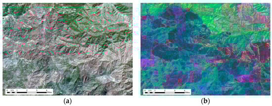Principal component analysis (PCA) enabled tests of the amount of information that could be retained by taking into account all of the hyperspectral bands and reducing that dimensionality down to three principle components. PCA accomplishes dimensionality reduction by linearly transforming data into a coordinate system in which most variation can be described using only a few initial dimensions. The raster was transformed into three bands using the Principal Components tool in ArcGIS Pro [47]. The Principal Components tool allows a user to input a raster, specify the number of principal components, and then transform the input bands to a new attribute space where the axes are rotated with respect to the original space [31]. Figure 6 shows a comparison between the PCA-transformed bands and the RGB bands of the McFarland Fire.
