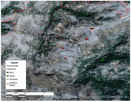 Partitioning the classes beyond burned and unburned was necessary to obtain accurate results from the SVM. SVMs in their simplest form perform binary classification by calculating a hyperplane separating pixels into two classes. It would be difficult for an SVM to identify the hyperplane separating burned and unburned classes due to a wide range of pixel values. For example, the burned class contains low RGB pixel-valued black ash and high RGB pixel-valued white ash. Furthermore, the unburned class is composed of several green, brown, and blue colors whose values vary widely on the RGB scale, but lie between black ash and white ash in the RGB space [17]. To increase spectral difference between classes, the burned and unburned classifications were partitioned into two burned and three or four unburned classes in order to make the individual classes more linearly separable, allowing the SVM to perform multiclass classification. The SVM was able to perform multiclass classification using several hyperplanes with increased accuracy due to the linear separability of the pixel values. After classification, classes were re-generalized back to burned vs. unburned for burn extent and white vs. black ash for burn severity. An example of some training polygons is shown in Figure 7.