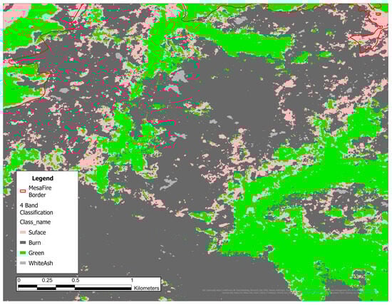 The SVM was trained on images with the previously mentioned set of bands for each of the fires using the training polygons for that specific fire. Once trained on an image, the SVM classified the image, creating the previously mentioned burned (black and white ash) and unburned (vegetation and bare dirt along with water for the Four Corners Fire) layers. To create the burn extent layer for the McFarland and Mesa fires, all burned (white ash and black ash) and unburned (vegetation, land, noise for Mesa) areas were classified and left in their separate classes for validation. Once the images were classified, the ArcGIS Pro Reclassify tool [51] could be used to combine the black and white ash classes into a burned class and the vegetation and bare earth classes back into an unburned class. Figure 8 shows an example of a classification produced by the SVM.