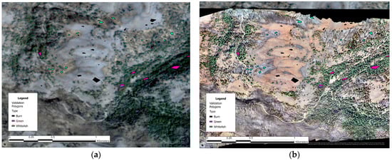 Validation data was drawn to assess the accuracy of the SVM. Using the Create Feature tool in ArcGIS Pro, we created a new raster layer that was made up of several polygons. Each polygon was digitized with 100% certainty of which class it fell under and was labeled with that class. Figure 9 shows a few different validation polygons and their associated classes. Drone imagery for the Mesa Fire was acquired during a previous collaborative effort with the US Forest Service. This hyperspatial drone imagery was used to acquire more precise validation data, which was especially useful when identifying areas of white ash [13], allowing the validation of the Mesa Fire to conform to the International Global Burned Area Satellite Product Validation Protocol [52]. The drone imagery was coregistered with the PlanetScope satellite imagery, which made drawing validation polygons easier, as there was no conversion needed.