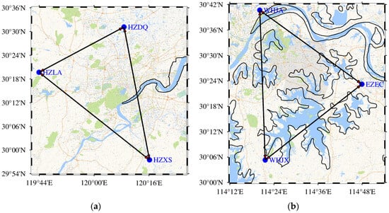 To evaluate the performance of the proposed medium baseline RTK, we selected six baselines at latitude 30°, namely HZDQ-HZLA, HZDQ-HZXS, HZXS-HZLA, WHJA-EZEC, EZEC-WHJX, and WHJX-WHJA, with the first three baselines located in Hangzhou and the remaining three baselines located in Wuhan. The distances of these baselines range from 45 km to 66 km, with data collection taking place on 23 May 2022, which corresponds to the DOY (day of year) 143. The distribution of these stations can be seen in Figure 1. These stations are equipped with a Septentrio PolaRx4 receiver, receiving BDS/Galileo/GPS multi-frequency signals at a data sampling rate of 5 s. Three data processing schemes were set up: Scheme 1 used dual-frequency data, including BDS B1I/B2a, Galileo E1/E5a, and GPS L1/L2; Scheme 2 used triple-frequency data, including BDS B1I/B2a/B3I, Galileo E1/E5a/E5b, and GPS L1/L2/L5; Scheme 3 simultaneously used both dual-frequency and triple-frequency data. When performed RTK data processing, the software Net_Diff developed at the GNSS Analysis Center of Shanghai Astronomical Observatory was used [].