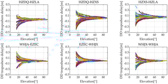 Although the estimated DD troposphere delay in Equation (9) is in the zenith direction, it needs to be projected onto the station-satellite direction through a mapping function. In this section, we first conducted precise point-positioning ambiguity resolution (PPP-AR) at each station to derive precise slant troposphere delay [,]. Then, the DD slant troposphere delay of ambiguity-fixed satellites is constructed by using between-satellite single-difference and between-receiver single-difference. Figure 2 plots the DD slant troposphere delay for six baselines, with an elevation angle mask of 15°. It can be seen that the DD troposphere delay is negatively correlated with the elevation angle. When the elevation angle is greater than 20°, the DD troposphere delay is generally less than 15 cm, which is less than a quarter of the wide-lane wavelength. Taking the baseline HZDQ-HZLA as an example, the root mean square error (RMSE) of DD troposphere delay for all ambiguity-fixed satellites is calculated and their mean value is 6.2 cm. As a result, it can be disregarded when solving the wide-lane ambiguity in Equation (8).