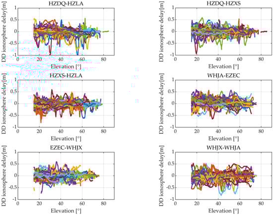As shown in Equation (9), the DD ionosphere delay is slant and satellite-dependent. In order to obtain precise DD slant ionosphere delay, after PPP-AR at each station, the geometry-free phase observation is used []. Then, the DD slant ionosphere delay for Frequency 1 (in meters) is also constructed by using between-satellite single-difference and between-receiver single-difference. Figure 3 plots the DD slant ionosphere delay for six baselines, with an elevation angle mask of 15°. It can be observed that, compared to DD troposphere delay series, DD ionosphere delay series variation is more severe. The DD ionosphere delay of some satellites can be significant, with values still exceeding 0.5 m when the elevation angle is greater than 40°. However, the majority of satellites exhibit a negative correlation between the DD ionosphere delay and the elevation angle.