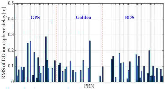 Taking the baseline HZDQ-HZLA as an example, the RMSE of DD ionosphere delay for all ambiguity-fixed satellites is calculated, as shown in Figure 4. It can be seen that the DD ionosphere delay RMSE of all satellites is less than 0.3 m, with only four satellites having an RMSE greater than 0.2 m. The average RMSE for all satellites is 10.7 cm, which is smaller than the quarter-wavelength of the wide-lane wavelength; thus, it can be ignored when performing wide-lane ambiguity resolution.