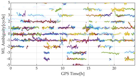 Furthermore, considering the simultaneous impact of ionosphere delay and troposphere delay on the WL ambiguity resolution, we provide time series of float WL ambiguities based on Equation (8), using the HZDQ-HZLA as an example. Here, only ambiguities within ±5 cycles are plotted, as shown in Figure 5. It can be observed that the float WL ambiguities fluctuate mainly around integer cycles, demonstrating relatively good stability, indicating the feasibility of simultaneously neglecting DD ionosphere and troposphere delay residuals.