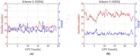 (a) The satellite number and PDOP of Scheme 2; (b) The satellite number and PDOP of Scheme 3.