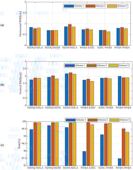 Using the three schemes described in Section 3, we performed the RTK algorithm described in Section 2 for positioning. We calculated the positioning RMSE in both the horizontal and vertical directions, as well as the fixing rate, which represents the proportion of correctly fixed solutions out of the total epochs, as shown Figure 7. A correctly fixed solution is defined as a solution with a ratio greater than 3.0 and a 3D positioning error less than 10 cm.