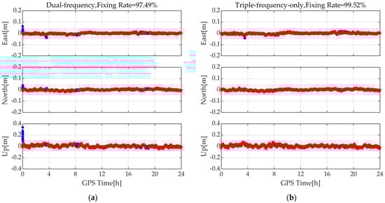 (a) The positioning error series of Scheme 1 for WHJX-WHJA; (b) The positioning error series of Scheme 2 for WHJX-WHJA. The blue point represents the float solution and the red point represents the fixed solution.