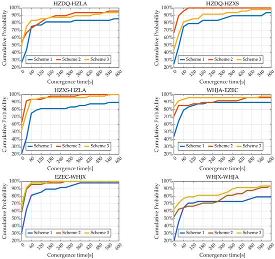 The probability distribution of the convergence time for 48 sessions of HZDQ-HZLA, HZDQ-HZLA, HZXS-HZLA, WHJA-EZEC, EZEC-WHJX, and WHJX-WHJA.