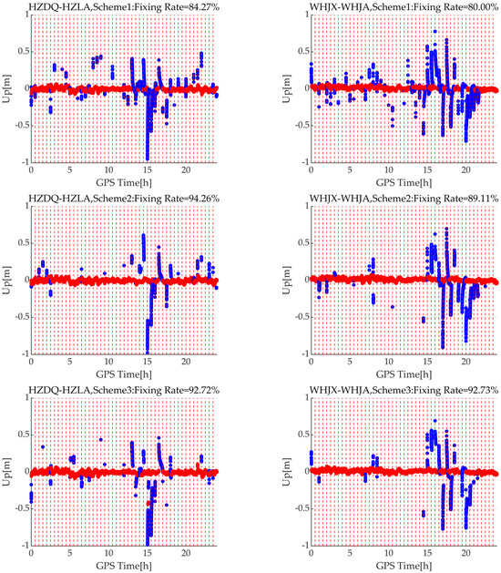 The positioning error in the Up direction for HZDQ-HZLA and WHJX-WHJA when using Scheme 1, Scheme 2, and Scheme 3. The red dots represent fixed solutions, while the blue dots represent float solutions.