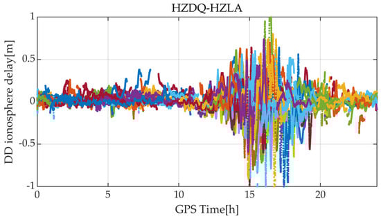DD ionosphere delay time series of HZDQ-HZLA. Each colored line represents a satellite.