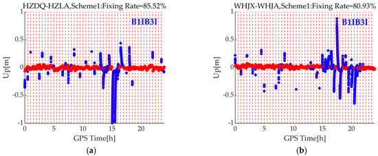 (a) The positioning error in the Up direction for HZDQ-HZLA, using dual-frequency BDS B1I/B3I and (b) The positioning error in the Up direction for WHJX-WHJA, using dual-frequency BDS B1I/B3I. The red dots represent fixed solutions, while the blue dots represent float solutions.