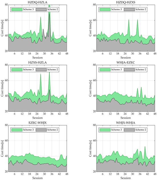 For high-frequency terminals, such as those operating at 10Hz, the computational time of the RTK algorithm is an essential consideration. Excessive computational power consumption will lead to an increase in hardware costs. Considering the advantage of accelerated convergence through triple-frequency observations, this section compares the computational time of Scheme 2 and Scheme 3. Based on the Intel i7-10700 processor with a clock frequency of 3.8 GHz, the processing time of 48 sessions for the 6 baselines is shown in Figure 13.