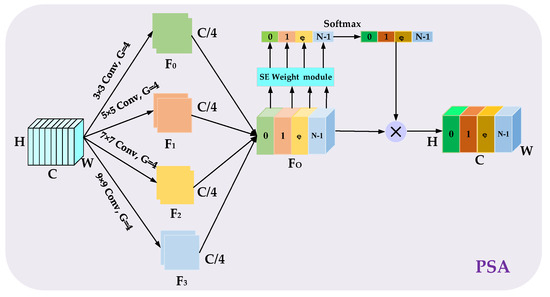 A pyramid squeeze attention (PSA) module [51] is introduced at the end of AEAMFI-Det to fuse the obtained multiple features and perform information interaction between the channel attentions for better interdependence refinement. As Figure 2, the PSA module has two main parts: multiscale feature extraction and channel attention weight acquisition. First, features of different spatial resolutions containing different levels of information can be obtained using grouped convolutions of different sizes in the pyramid structure to extract key information from feature maps at different scales. Through the compression of channel dimensions in each branch and the execution of local cross-channel interactions, the approach effectively extracts multiscale spatial features from the channel-level feature maps. For computational convenience, we set the number of grouped convolutions to four.