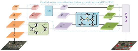 AEAMFI-Det is a one-stage framework that combines CNN and cross-attention for multiscale RSOD in realistic scenarios. The framework enables long-range modeling while suitably retaining the inductive bias of CNNs, which allows for superior accuracy while keeping the computational effort relatively low. As Figure 3 shows, the RS image is provided as input. Four feature layers, from low levels to high levels , are first extracted using the CSPDarknet53 [53] backbone, containing coarse-grained features. Next, a new aggregation strategy, AEA, is used to fuse low-level edge features adaptively. This aggregation strategy uses an edge enhancement mechanism to attend adaptively to multidirectional edge features and enables the model to learn and incorporate spatial dependencies across multiple scales. Then, in an attempt to enhance the multiscale feature interactions, a new fusion architecture, 2CA-FPN, is designed. The 2CA-FPN fully fuses the feature information of different scales by adopting a level-by-level feature fusion approach. In 2CA-FPN, we design FEM, which first mines effective local and nonlocal contextual information as auxiliary information to acquire semantic similarities and differences across multiscale features through information interaction at the spatial level in a cross-attention manner. After effectively extracting the multiscale spatial feature information at a finer granularity level, the PSA module is presented to process spatial information with multiscale features further to establish the long-term dependency between multiscale channel attentions effectively to achieve better refinement of the spatial and channel dimensional interdependencies. Finally, the detection head of the framework consists of two compact and parallel sub-networks: one for classification and the other for regression. These sub-networks work in tandem to generate the final detection results.