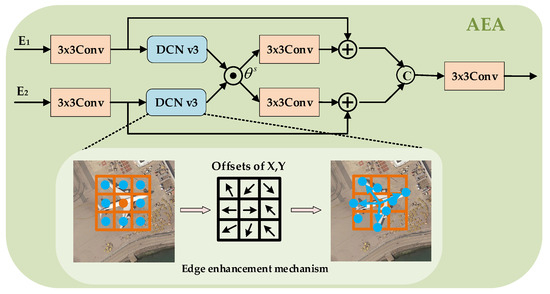 In general, low-level features encompass a mix of visual clues and noise, including edges, corners, and lines, as well as uncorrelated high-frequency signals [56]. However, this amalgamation can lead to a misalignment of the network’s attention with the actual objects in RS images. To address this issue, we introduce the AEA module, specifically designed for the low-level feature map . The module uses an edge enhancement mechanism to capture edge information between features at different scales. We aim to selectively emphasize the relevant visual cues while suppressing noise and irrelevant information.
