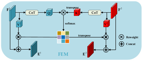 Since the inputs to the FEM are paired feature maps, we uniformly denote the input feature pairs of different scales as , where . As Figure 5 shows, the more representative features and are first obtained using CoT blocks to capture both local and nonlocal context information of the input for and , respectively, where , is the channel count of the low-dimensional feature map. We then reshape and into the , where . The and communicate across image information through feature interaction. Therefore, we designed two branches to augment the feature representation for each of the two inputs. We multiply query and the transpose of key to obtain the first feature map and transpose that feature map to obtain the second feature map. Then, we compute the attention maps and using layers.