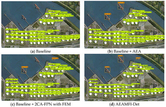 Figure 6 demonstrates the visualization effect of 2CA-FPN with FEM and AEA module. The baseline model accurately detects the storage tank but fails to detect the ship. By incorporating the AEA module into the baseline, the network successfully detects two ships of similar scales by leveraging the edge enhancement mechanism. It captures the edge information of the objects and learns the spatial multiscale nonlocal dependency. Furthermore, with the addition of 2CA-FPN with FEM on the baseline, the network effectively explores both global and local contextual information of the objects. It employs cross-attentive interactions to fuse information, enabling the capture of cross-image semantic similarity between multiscale features. This approach effectively suppresses matching noise caused by local similarity between classes and enhances intra-class correlation. As a result, the network successfully detects the small-scale ship. However, due to the limited number of samples in the NWPU VHR-10 dataset, the transformer-based improved FEM could not be adequately trained, resulting in the unsuccessful detection of another ship. In contrast, our AEAMFI-Det model combines the AEA module and 2CA-FPN with FEM, benefiting from their synergistic effects and achieving the best detection results.