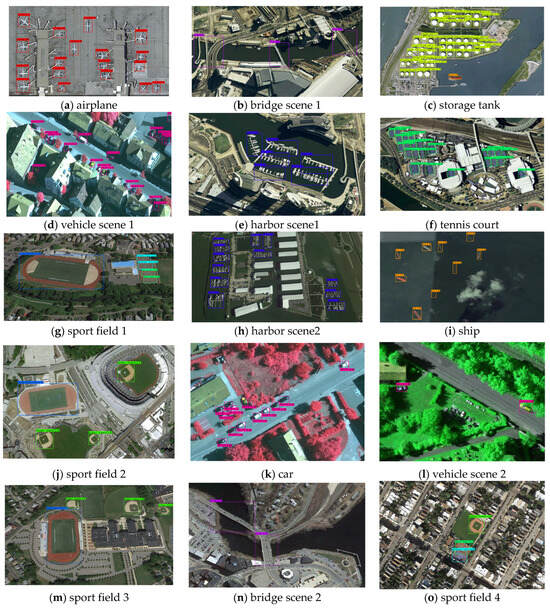 We executed the algorithms using the widely used PyTorch1.7.1 framework and a 16-GB RAM Nvidia GeForce RTX 4080 GPU. First, we randomly flipped 50% of the images in the dataset horizontally to increase the amount of data. The input image size of this calculation model was . SGD was used as the optimization algorithm, and the momentum, weight decay, and batch size were 0.9, 0.0001, and 4, respectively. The NWPU VHR-10 dataset was trained for 100 iterations. The learning rates were set to for the first 30 iterations that constituted the warm-up phase, for iterations 31–70, and for iterations 71–100. The DIOR dataset was trained for 150 iterations. The learning rates were set to for the first 30 iterations that constituted the warm-up phase, for iterations 31–90, and for iterations 91–150.