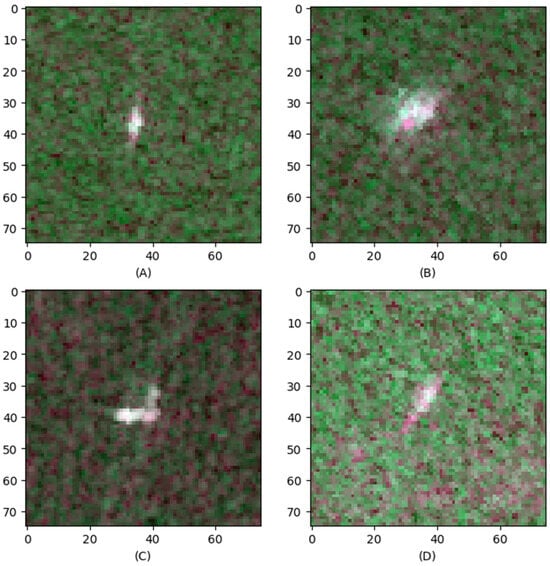 Figure 1. Four sample RGB images from the SAR dataset, where R = HH, G = HV, and B = (HH + HV)/2. (A,C) are ships, and (B,D) are icebergs. - The SAR Ship Detection Dataset (SSDD) stands as the pioneering, openly available dataset extensively employed for exploring state-of-the-art ship detection technology using DL from the SAR images [37]. The dataset had 39,729 images, including 17,648 HH and 14,713 HV images, where 4911 of them had both HH and HV images that were used in our research, which required both HH and HV bands. Since this dataset only provided ship images, in order to keep our data relatively balanced, we selected and combined 1000 of these pairs of HH and HV images with the SAR data. Figure 2 illustrates two sample images from this dataset. A summary of both datasets are presented in Table 1.
