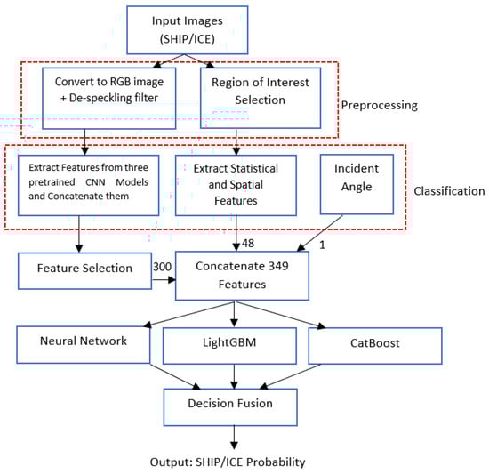 In this paper, we modified the method outlined in [40], augmenting it with the inclusion of quantitative (statistical and spatial) features in addition to the CNN-based features obtained from various CNN models. The CNN features that were extracted were subsequently pruned, selecting only the best 300 features based on mutual information between the features and targets [41]. These selected features were then combined with the quantitative features, forming a concatenated feature set. This composite feature set was utilized for the classification of ship and iceberg images. The system architecture is depicted in Figure 3. As depicted, images from different datasets underwent initial preprocessing, followed by parallel stages of feature extraction. The resultant features were then merged, and the classification was performed using three machine learning techniques: NN, LightGBM, and CatBoost. The resulting probabilities from these methods were aggregated through a decision tree to calculate the final log loss score. Further details regarding each component are elaborated below.