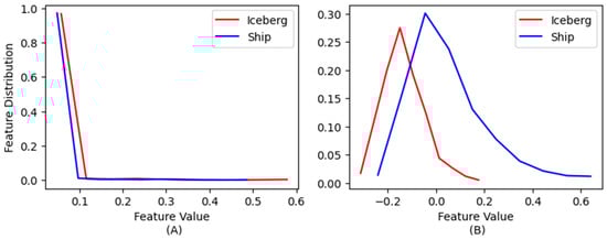 These figures show distributions of (A) a weak feature and (B) a strong feature extracted using pre-trained CNN models for ship and iceberg images in the SAR dataset. The mutual information computed for these two features is zero and 0.165, respectively.