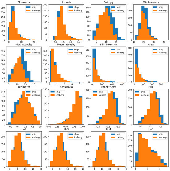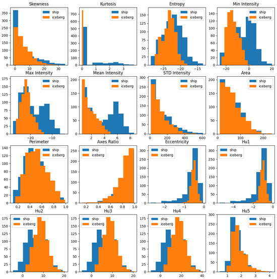 We analyzed the effects of individual features by comparing histograms for each statistical and spatial attribute separately for ships and icebergs. This analysis helped us understand the influence of each feature on the overall classification performance. For instance, if the histograms for ships and icebergs showed a significant overlap with regard to a particular feature, it suggested that the feature provided limited valuable information for the classification of object labels. Consequently, its impact on the discrimination performance was minor. Conversely, if the histograms for ships and icebergs exhibited minimal overlap and distinctness for a specific feature, this indicated that the feature imparted valuable information related to the target label and contributed significantly to the overall performance. Figure 6, Figure 7, Figure 8 and Figure 9 depict the histograms of the features extracted from the ships and icebergs individually for the HH, HV, HH − HV, and HH + HV bands, respectively.