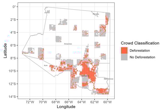 Results of the crowdsourcing campaign over the Brazilian Amazon between June and November 2020. Map of the 390,000 km2 (43,108 images) classified by the crowd as having either evidence of deforestation or no deforestation. Individual pixels represent a 3 × 3 km image.