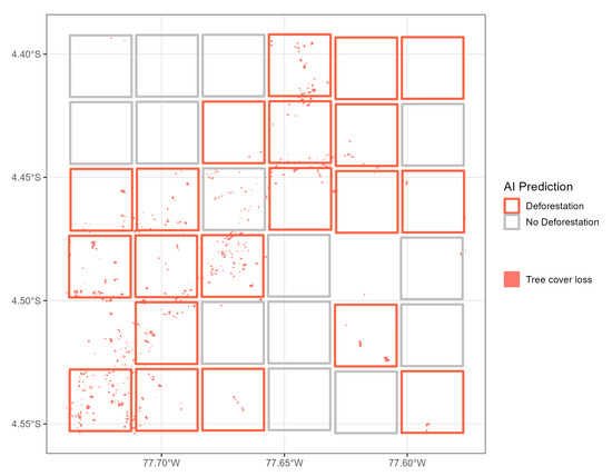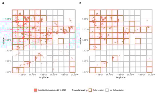 A comparison of results from our crowdsourcing campaign with (a) global annual tree cover loss and (b) Brazil’s PRODES satellite deforestation datasets for a subset of the study area. We considered only tree cover loss and PRODES satellite observations from the period 2010–2020, as earlier disturbance is likely no longer visible to the crowd. The pixel outlines in red and gray (3 × 3 km) represent the unique crowdsourcing image locations identified as containing either signs of deforestation or no deforestation, respectively.