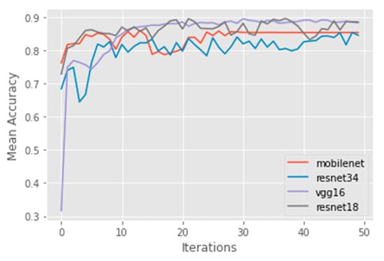 We randomly partitioned our newly established crowdsourced image library of approximately 43,000 images with labels assigned through crowd consensus (or expert review) into datasets for training, validation, and testing, i.e., 60%, 20%, and 20%, respectively. We then proceeded with the testing of a series of deep-learning models, trained on the available training images each month, including VGG16 [31], ResNet18, ResNet34 [32], and MobileNet [33]. At the end of the analysis, the ResNet18 model slightly outperformed all others, although all models performed well after almost 50 iterations (Figure 3). As Supplementary Figure S3 demonstrates, all architectures tested appear to be reasonable choices.