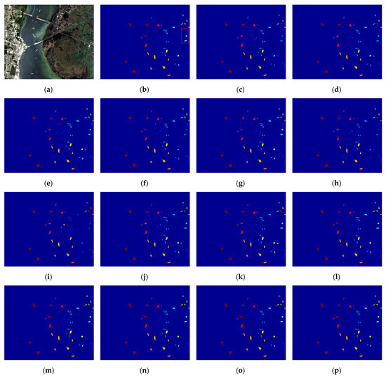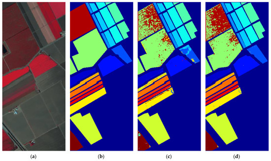The SV dataset was also acquired using the AVIRIS sensor, with an image size of 512 × 217 pixels. It includes 204 valid bands and has a spatial resolution of 3.7 m. There are 16 labeled land cover classes. Table 4 (below) displays the specific names of the 16 land cover classes, along with the quantities of the 10% training samples and 90% testing samples.