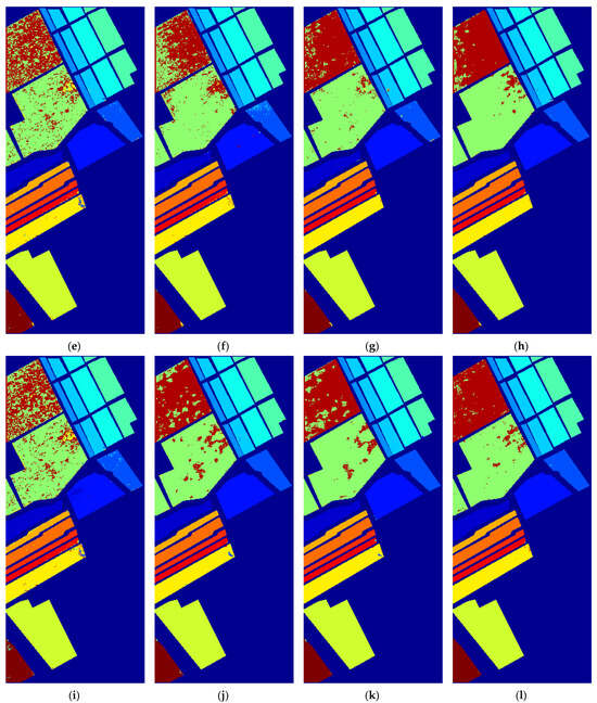 Classification results with and without spatial shuffle on IP, SVm and UP datasets. (a) ViT without spatial shuffle; (b) ViT with spatial shuffle; (c) SimpleViT without spatial shuffle; (d) SimpleViT with spatial shuffle; (e) CaiT without spatial shuffle; (f) CaiT with spatial shuffle; (g) LMViT without spatial shuffle; (h) LMViT with spatial shuffle; (i) ATSViT without spatial shuffle; (j) ATSViT with spatial shuffle; (k) Ens1 without spatial shuffle; (l) Ens1 with spatial shuffle.