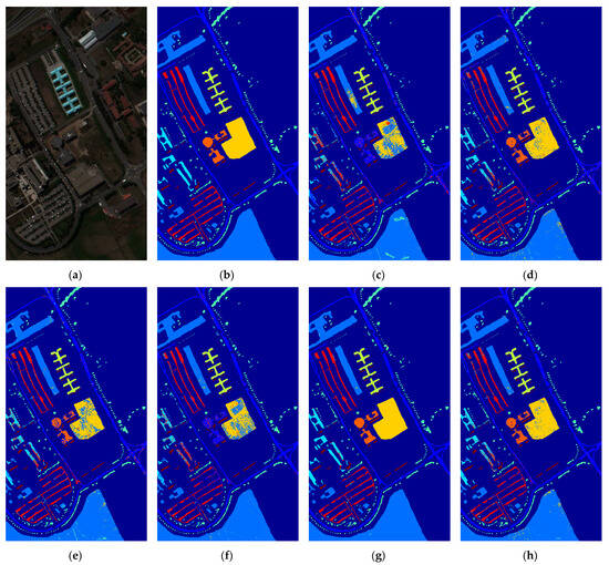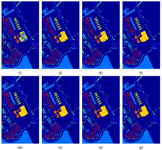 The UP dataset was acquired using the Reflective Optics System Imaging Spectrometer (ROSIS) sensor and is a part of the University of Pavia campus. It has an image size of 610 × 340 pixels and consists of 103 valid bands. The spatial resolution is 1.3 m, and the spectral range spans from 430 to 860 nanometers. The ground truth of the dataset includes nine land cover classes. Overall, 10% of the labeled samples were selected as training samples. The specific land cover classes and the quantities of samples are shown in Table 7.