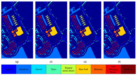 Classification results on UP dataset. (a) original HSI; (b) ground truth; (c) MLR; (d) SVM; (e) RF; (f) ELM; (g) CNN2D; (h) PPF; (i) SF_pixel; (j) SF_patch5; (k) SF_patch7; (l) ViT; (m) SimpleViT; (n) CaiT; (o) DeepViT; (p) ViTPM; (q) LMViT; (r) ATSViT; (s) Ens1; (t) Ens2.