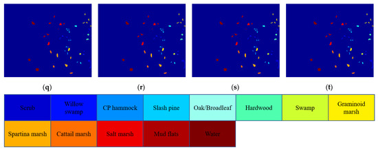 Classification results on KSC dataset. (a) original HSI; (b) ground truth; (c) MLR; (d) SVM; (e) RF; (f) ELM; (g) CNN2D; (h) PPF; (i) SF_pixel; (j) SF_patch5; (k) SF_patch7; (l) ViT; (m) SimpleViT; (n) CaiT; (o) DeepViT; (p) ViTPM; (q) LMViT; (r) ATSViT; (s) Ens1; (t) Ens2.